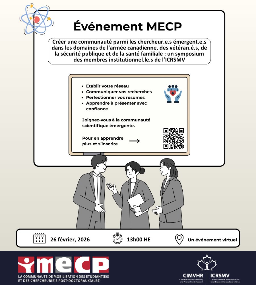 Joignez-vous à nous pour l’événement MECP : Créer une communauté pour les chercheur.e.s émergent.e.s dans les domaines de l’armée canadienne, des vétéran.e.s, de la sécurité publique et de la santé familiale : un symposium des membres institutionnel.le.s de l’ICRSMV. Cette conférence virtuelle est conçue pour soutenir les chercheuses et chercheurs en début de carrière par des rencontres, de la collaboration et le partage des connaissances.